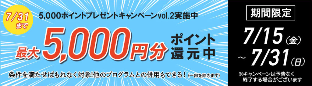 - 5,000ポイントプレゼントキャンペーンvol.2、お友達紹介プログラムを除く他のキャンペーンやプログラムとは併用できません。