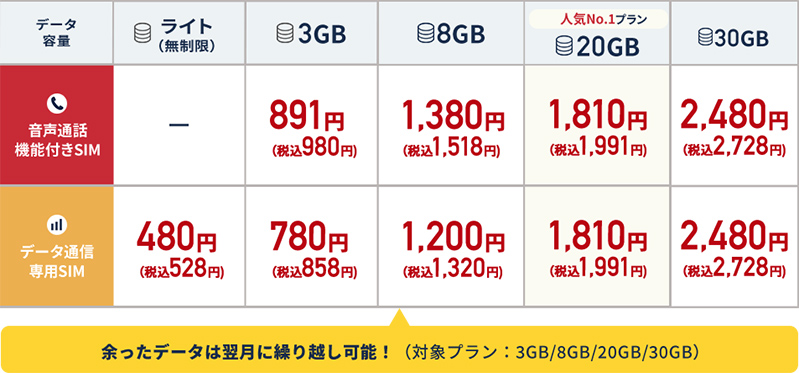 なっとくプラン(3GB)、なっとくプラン(8GB)、なっとくプラン(20GB)、なっとくプラン(30GB)その他: