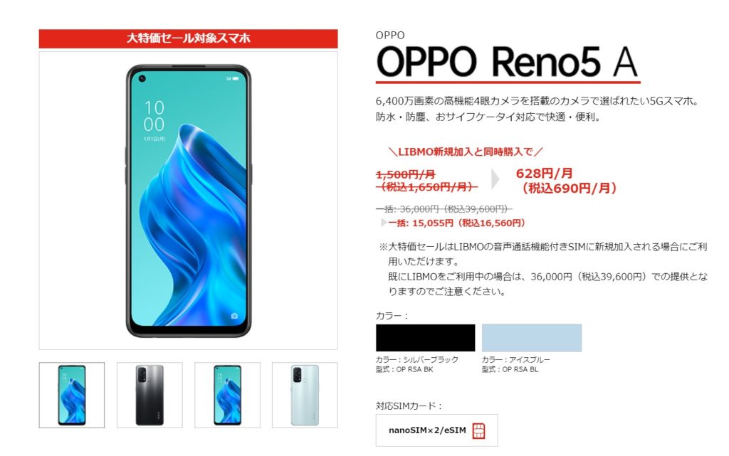 取扱端末はお申込み画面で確認できます。ただし、下記のReno5Aをキャンペーン特価(15,055円)で購入した場合、最大10000ポイント、5000ポイントの還元は対象外になります。